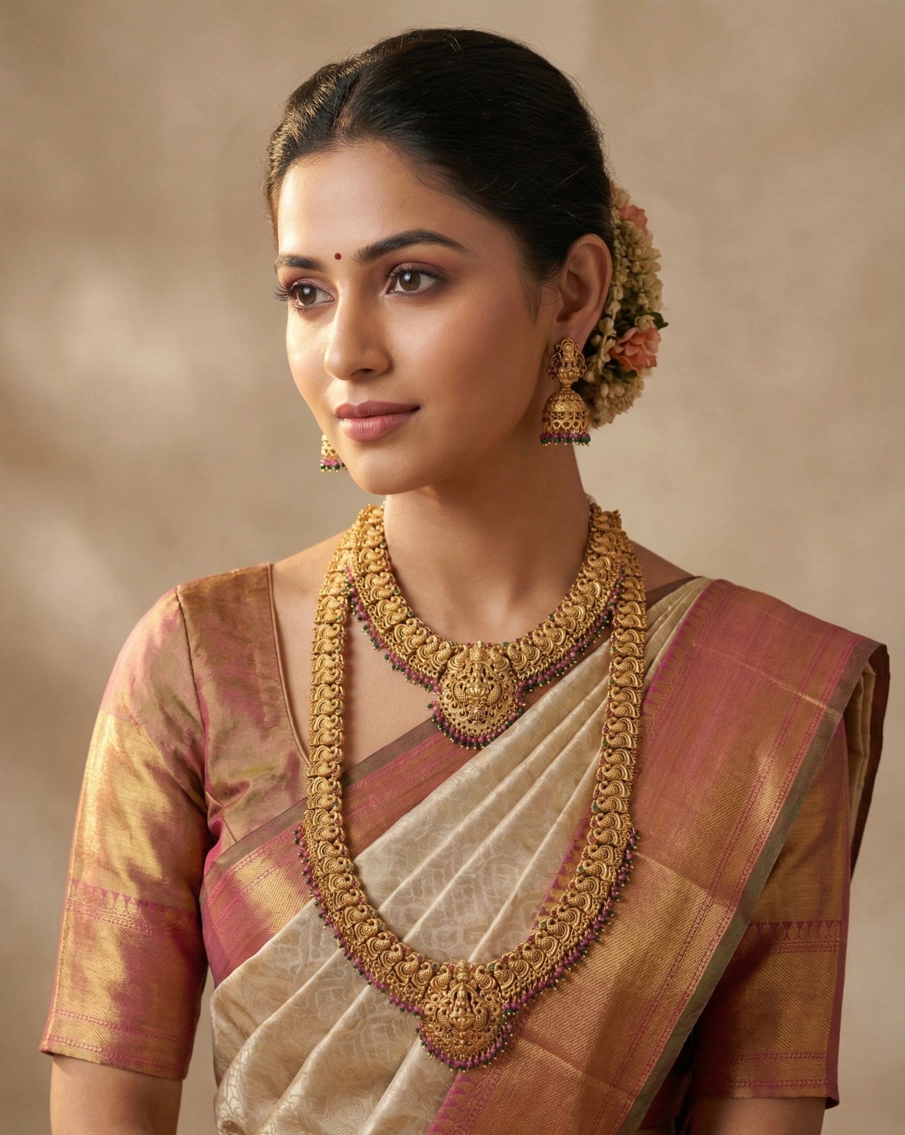 Embrace timeless elegance with this exquisite antique gold temple jewellery bridal set, featuring intricate peacock motifs and delicate coloured beads. This complete ensemble of a long haram, short necklace, and jhumka's will make you feel like royalty on your special day.