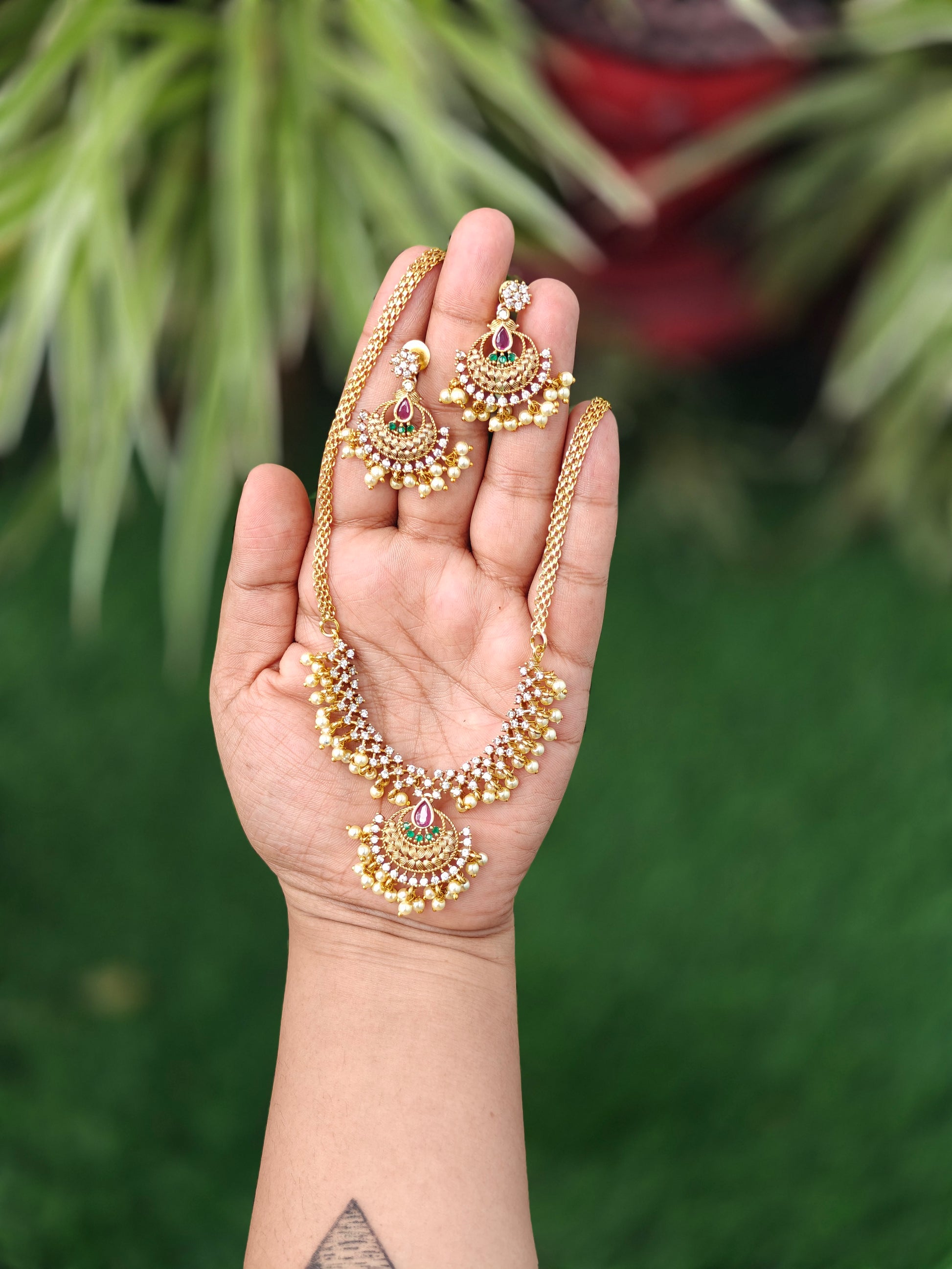 A graceful chandbali-style necklace set adorned with ruby and green stones, finished with layers of pearl danglers that capture the elegance of moonlight. Paired with matching earrings, this timeless piece beautifully blends tradition and charm, perfect for weddings, festive occasions, and cultural celebrations.