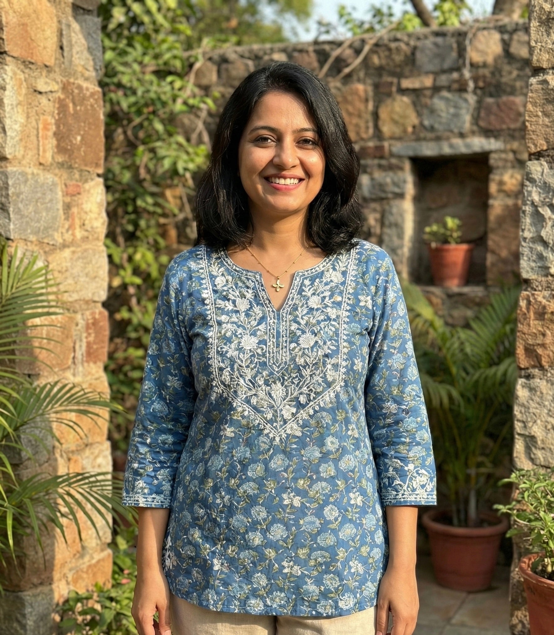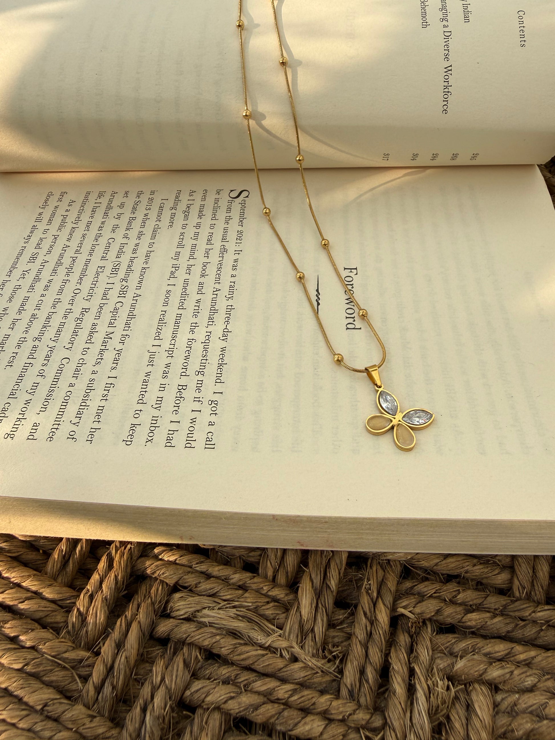 A delicate floral pendant accented with shimmering crystals, paired with a beaded gold chain for graceful everyday elegance.